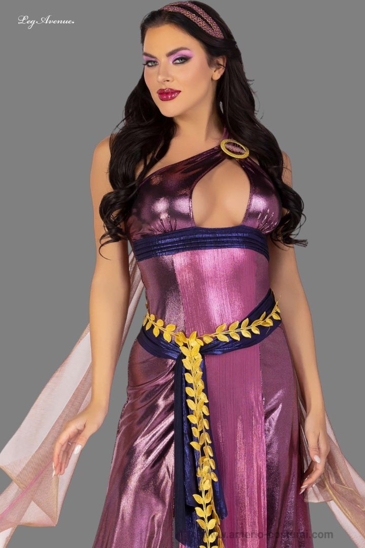 Trasforma la tua presenza in pura divinità con l’Amethyst Goddess Dress di Leg Avenue. L’abito asimmetrico scintillante cattura la luce ad ogni movimento, mentre la fibbia monospalla e il nastro aggiungono un dettaglio elegante e sofisticato. Il drappeggio iridescente, completo di passante per le dita, crea un effetto fluido e scenografico. La fascia in foglia d’oro e il cerchietto coordinato completano il look regale, perfetto per chi vuole interpretare una dea dall’allure magica.