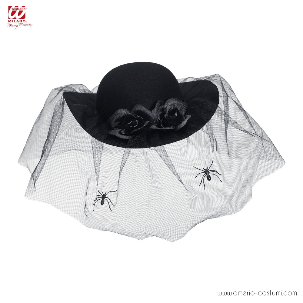 Cappello in feltro con rose e velo con ragni.