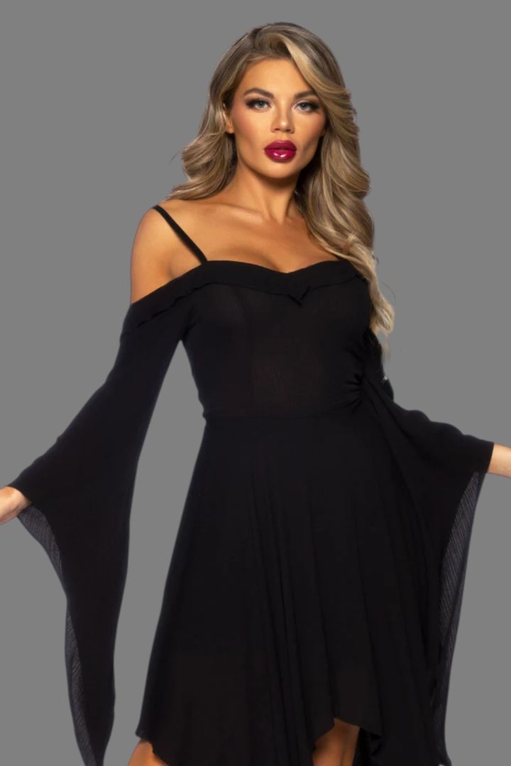 Costume Leg Avenue Cotton Bell Sleeved Dress: abito in cotone con scollatura a cuore, spalle scoperte, maniche a campana in garza e gonna a foulard. Perfetto per un costume da strega o vampira, ideale per Halloween. Disponibile in più taglie.