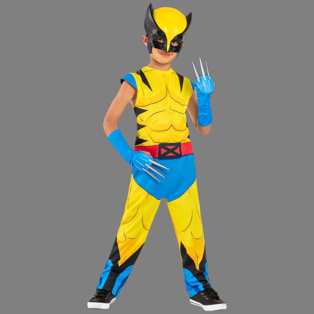Costume Wolverine bambino con tuta stampata, guanti con artigli e maschera. Perfetto per carnevale e feste a tema Marvel.
