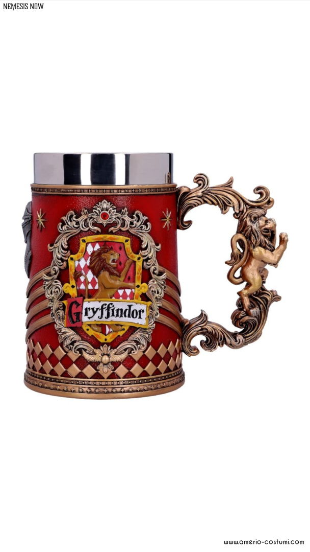 Gryffindor ist eines der vier Häuser von Hogwarts; seine Mitglieder sind für ihre Tapferkeit, Ritterlichkeit und Entschlossenheit bekannt. Das symbolische Tier ist der Löwe, der wunderschön innerhalb des Wappens auf den Seiten dieses beeindruckenden roten und goldenen Krugs dargestellt ist.