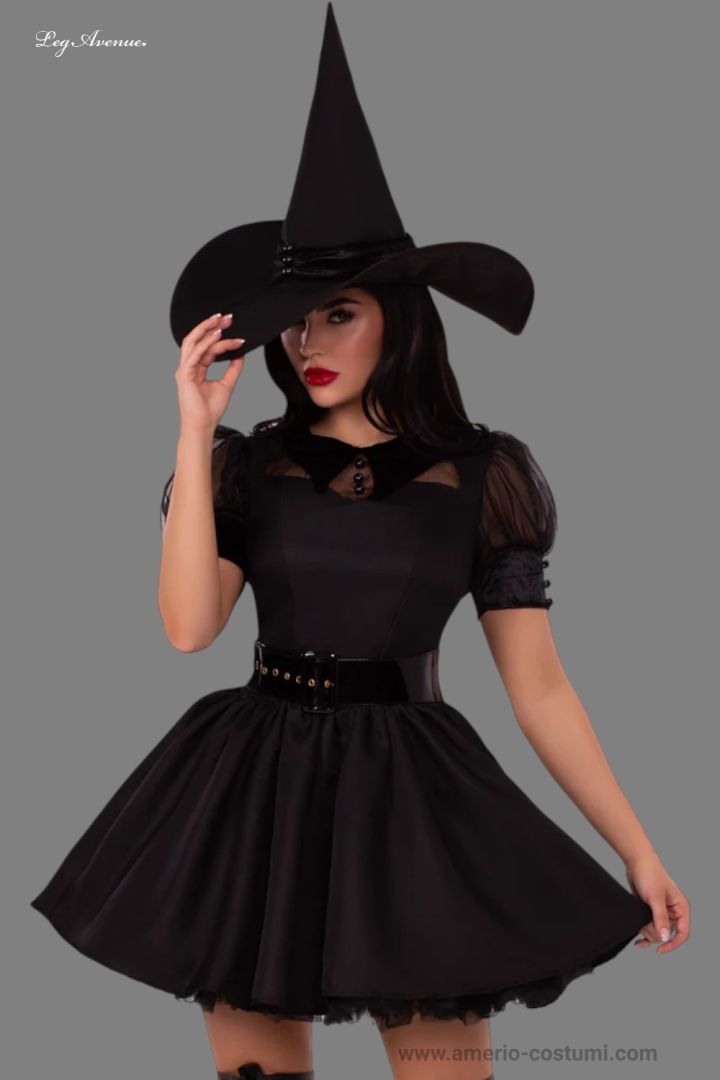 Enchant everyone with this vintage-style witch dress by Leg Avenue. The soft velvet bodice enhances the silhouette, while the back zipper ensures a perfect fit. The wide belt adds structure and a dramatic touch, completing the outfit with elegance. The matching hat transforms the look into a complete costume, perfect for portraying a charming and mysterious witch.