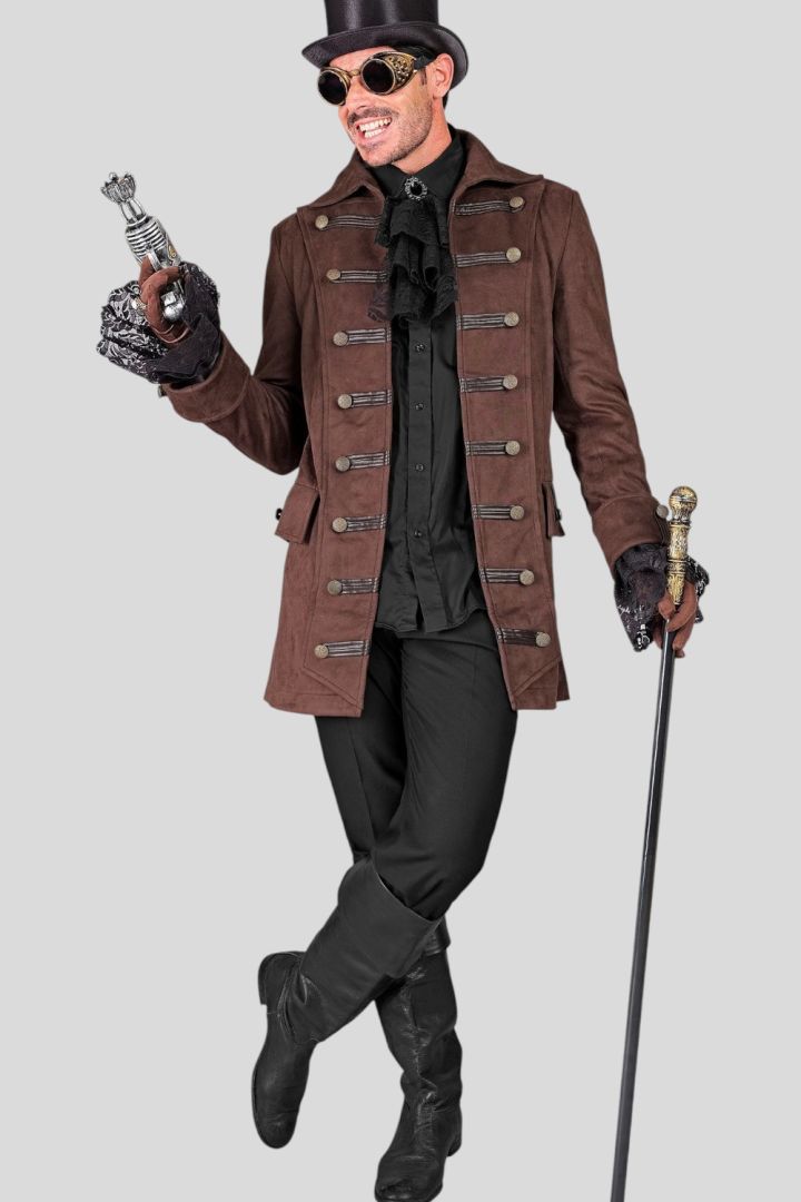 Make your look unique with this brown historical coat, a versatile piece with timeless charm. Perfect for completing pirate outfits, pairing with steampunk costumes, or adding a vintage touch to historical and themed performances.