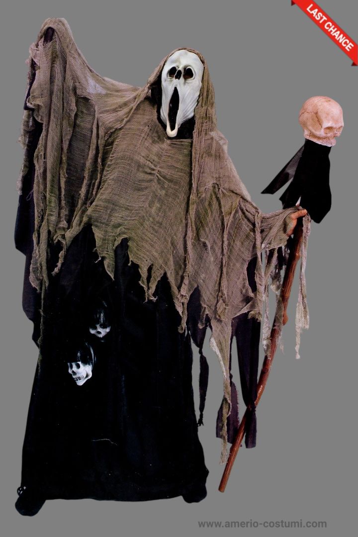 Includes a long black robe, a skull-decorated belt, a hooded cloak and a latex mask inspired by the iconic face of Ghostface (Scream).