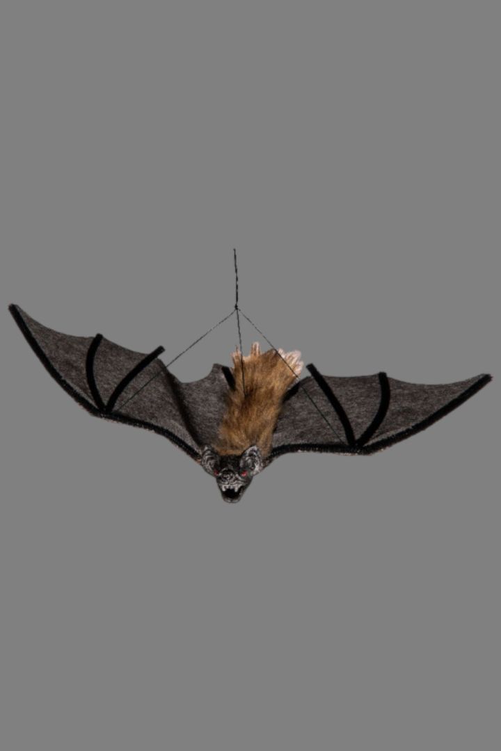 Plastic hanging bat with 40 cm wingspan. Ideal for Halloween, horror-themed parties, and spooky decorations.