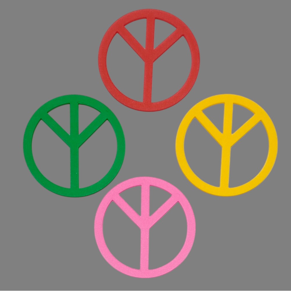 Collar Peace and Love impreso en PLA, diámetro de 80 mm, disponible en varios colores. Personalizable para eventos con medidas y tonos bajo solicitud.
