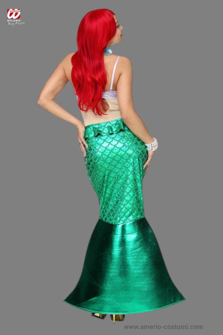 Disfraz de sirena compuesto por vestido con sujetador incorporado con colgantes y falda decorada con cola de sirena.
