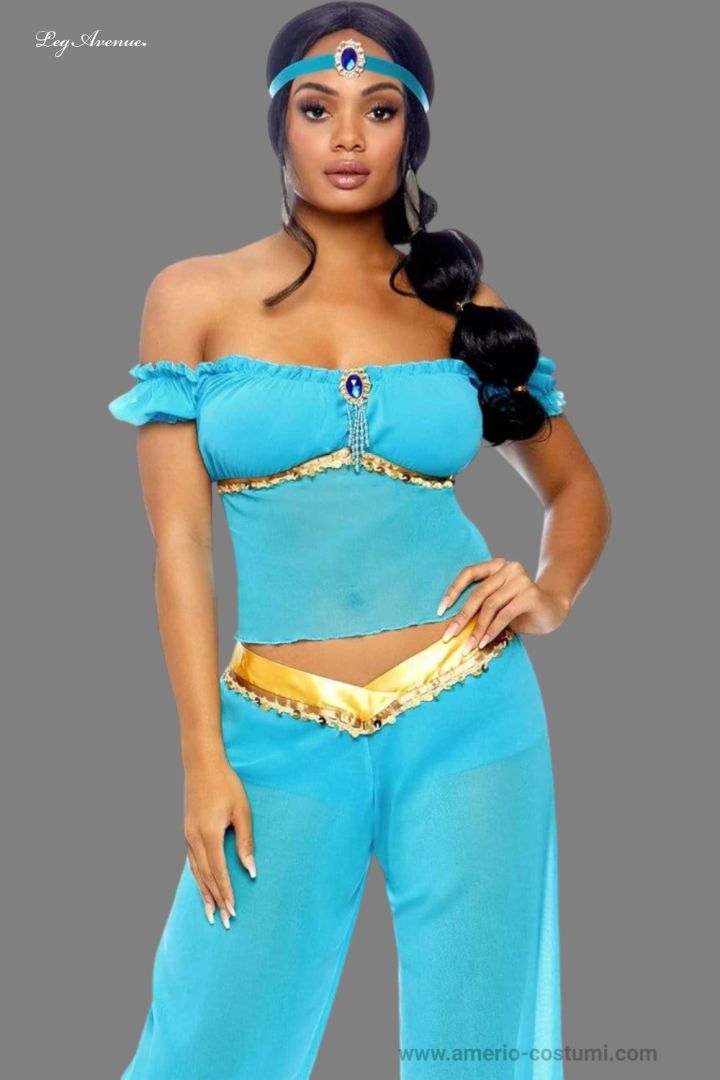 Costum Leg Avenue Arabian Beauty Top and Pants: top lăsat pe umeri cu monede și detalii de bijuterii, pantaloni harem cu chiloți integrați și bentiță asortată. Perfect pentru Halloween, petreceri tematice sau cosplay. Peruca nu este inclusă.