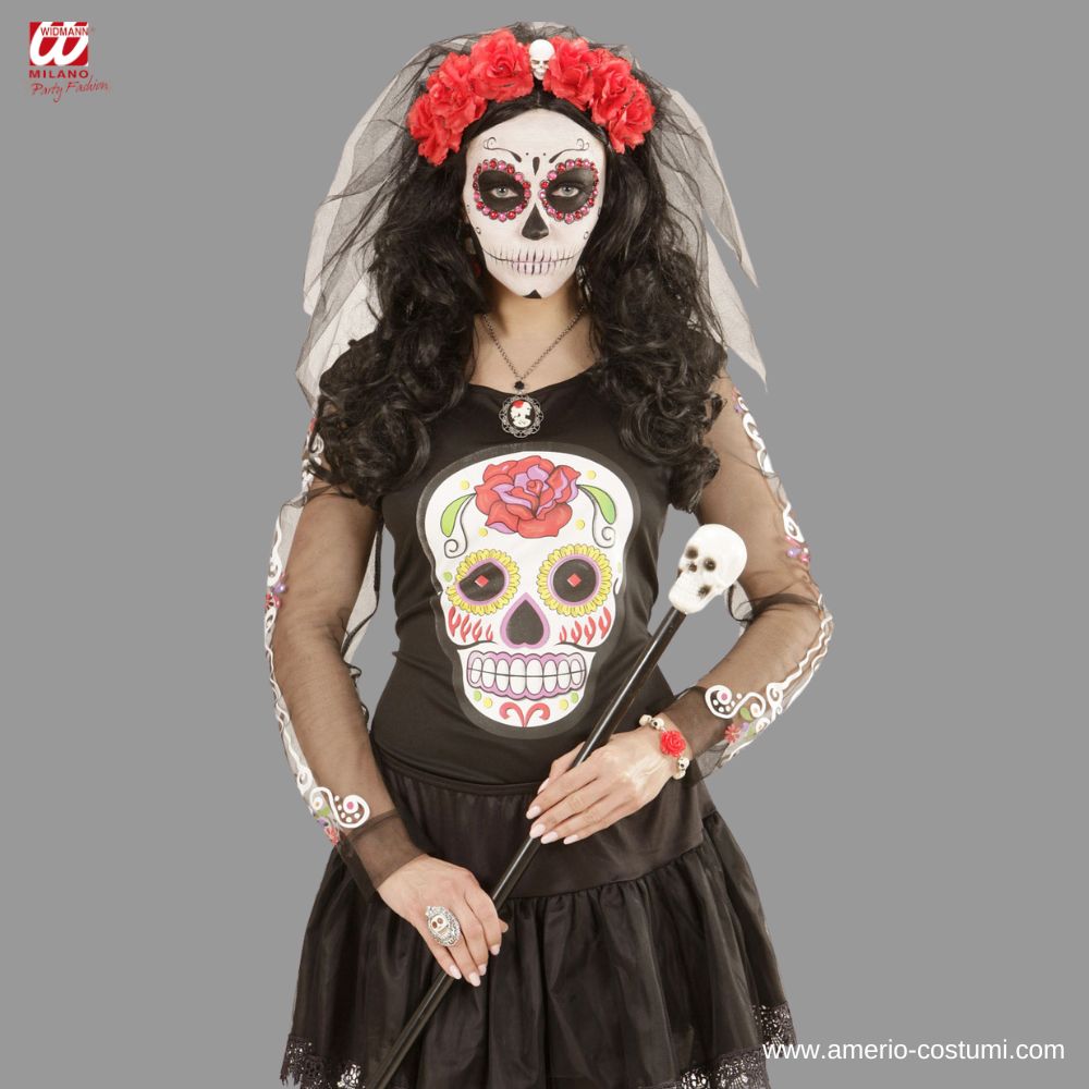 Adauga o nota de mister si farmec costumului tau cu aceasta bentita unica. Realizat din sase trandafiri rosii din material textil, un craniu central si un voile din tul usor, acest accesoriu este perfect pentru costumele inspirate de "Dia de los Muertos".