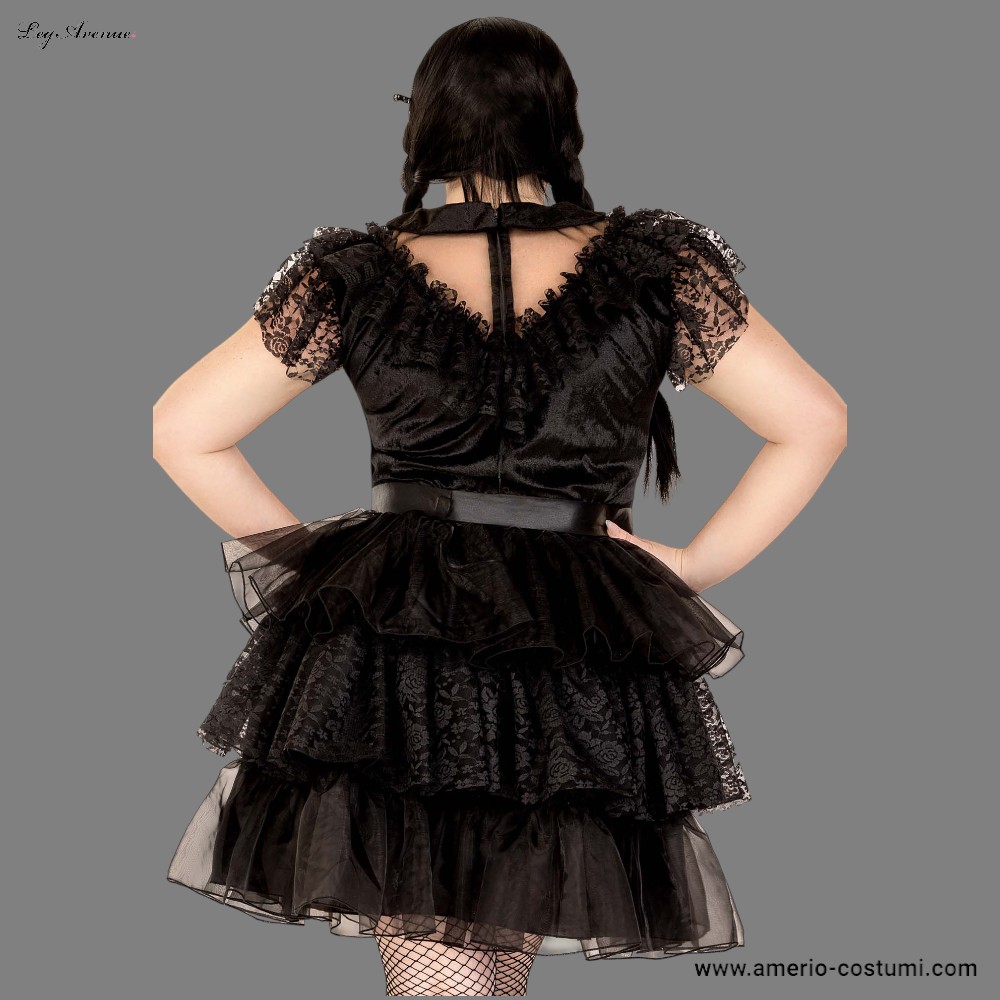 inspirat de rochia de bal a lui Miercuri, este compus dintr-o rochie din catifea și dantelă, o fustă din organza etereală cu mai multe straturi, o curea care strânge talia și o agrafă pentru păr în formă de cuțit îndrăzneață.